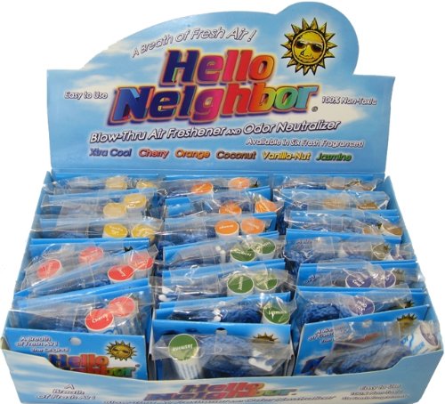 Hello Neighbor Personal Air Freshener and Odor Neutralizer. The worlds first blow thru personal air freshner. Eliminates all unwanted smelly odors. Just give a robust blow thru our patented tube system and enjoy the fresh clean air. Available in 6 fresh scents. Vanilla Nut, Orange Blossom, Coconut, Cherry, Jasmine and Menthol (Xtra) This is a very unique item that really works. Comes with a neck lanyard and a breakaway clasp. Great shelf life, product will not fade away. Elements are only active when blowing thru the Hello Neighbor Air Freshner. Works great in cars and RV's. Removes all smoke odor as well. Also works for pet odors, baby odors, foul restrooms, musty hotel rooms, dorm rooms, office cubicles, kitchens, and many, many more. Finally a breath of fresh air!